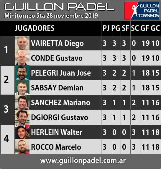 | Torneo Guillon Padel | J | G | SF | SC | GF | GC | ||