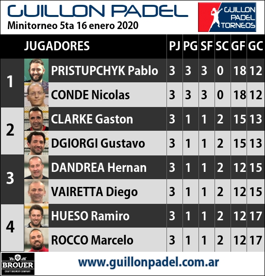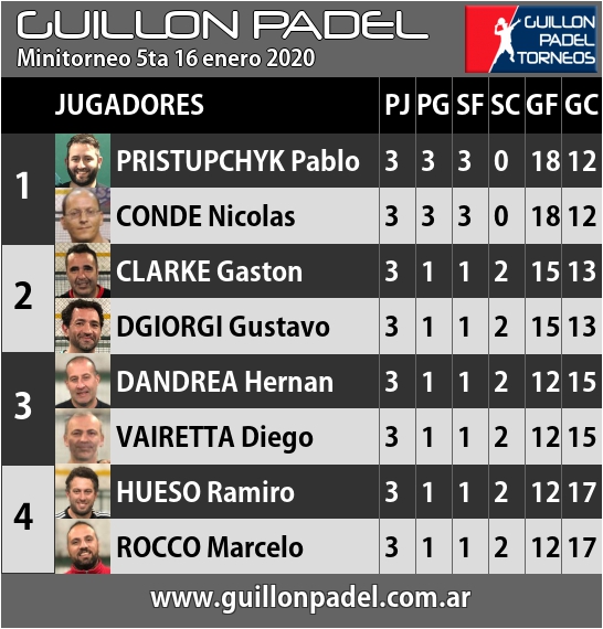 | Torneo Guillon Padel | J | G | SF | SC | GF | GC | ||