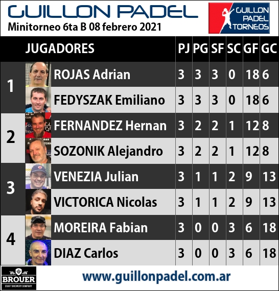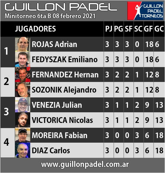 | Torneo Guillon Padel | J | G | SF | SC | GF | GC | ||