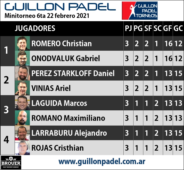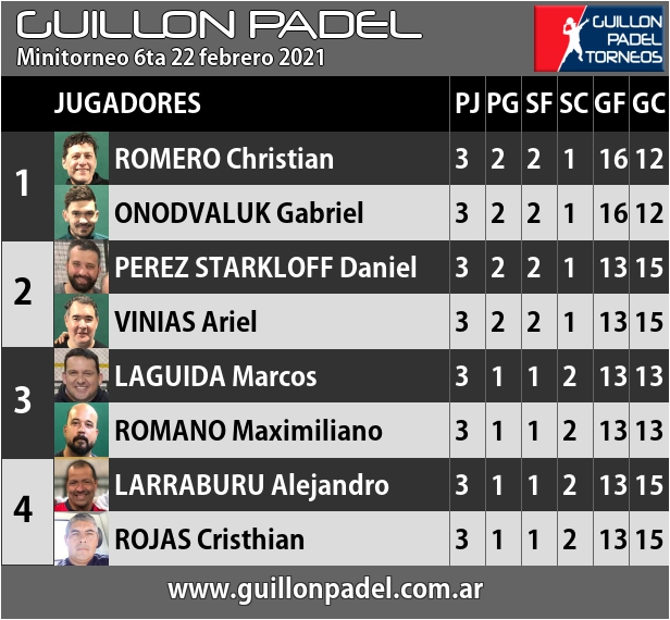 | Torneo Guillon Padel | J | G | SF | SC | GF | GC | ||