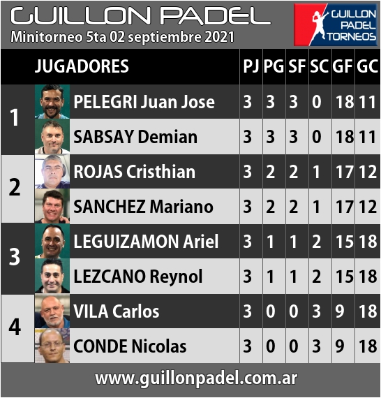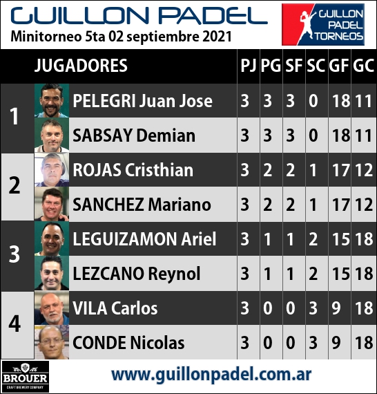 | Torneo Guillon Padel | J | G | SF | SC | GF | GC | ||