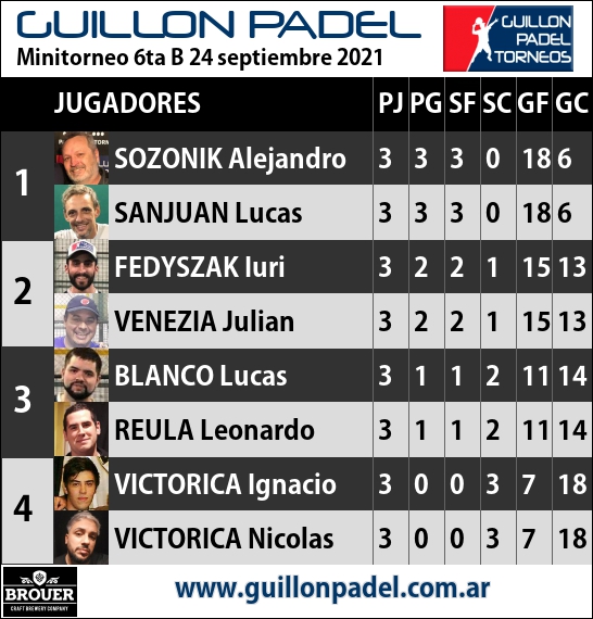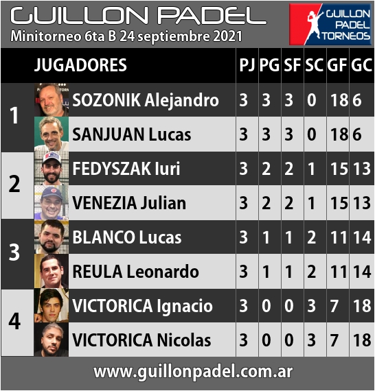 | Torneo Guillon Padel | J | G | SF | SC | GF | GC | ||