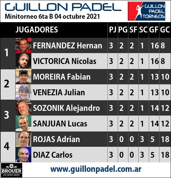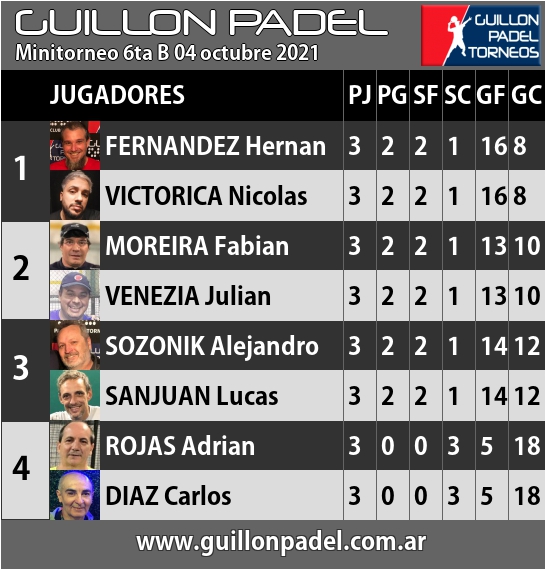 | Torneo Guillon Padel | J | G | SF | SC | GF | GC | ||