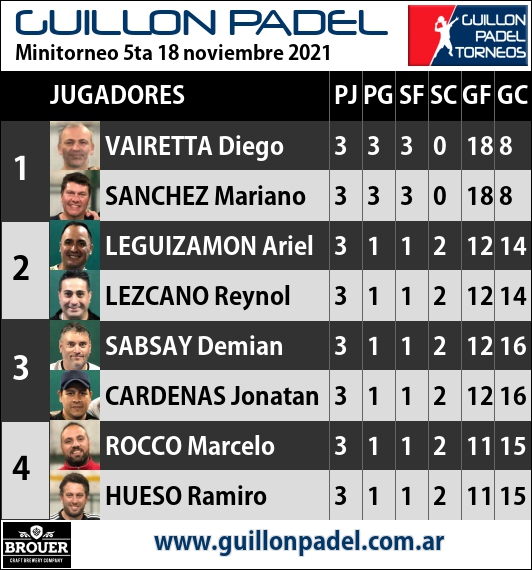 | Torneo Guillon Padel | J | G | SF | SC | GF | GC | ||