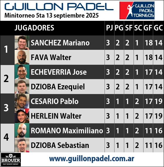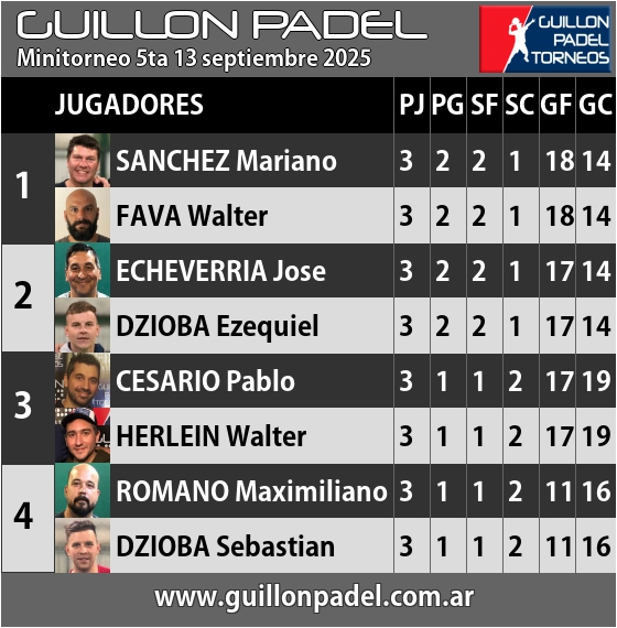 | Torneo Guillon Padel | J | G | SF | SC | GF | GC | ||
