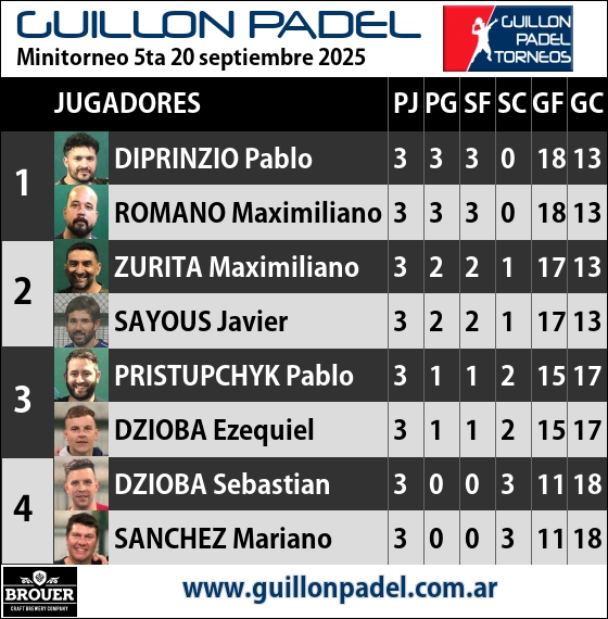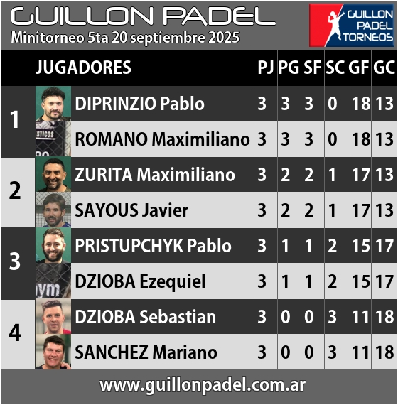 | Torneo Guillon Padel | J | G | SF | SC | GF | GC | ||