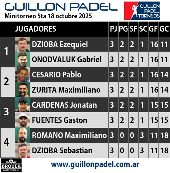 Torneo Guillon Padel ![]() | J | G | SF | SC | GF | GC | ||