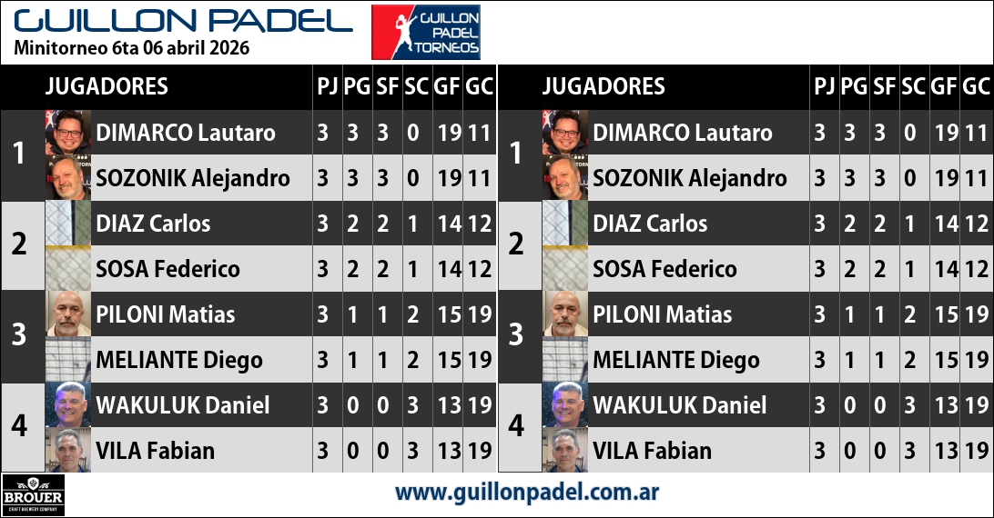 | Torneo Guillon Padel | J | G | SF | SC | GF | GC | ||