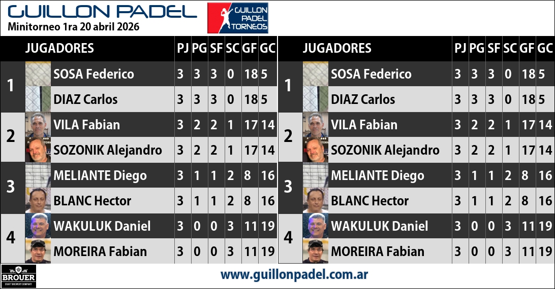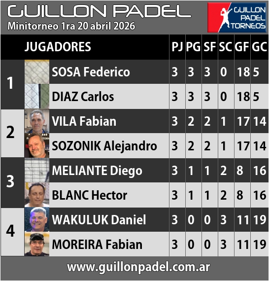 | Torneo Guillon Padel | J | G | SF | SC | GF | GC | ||