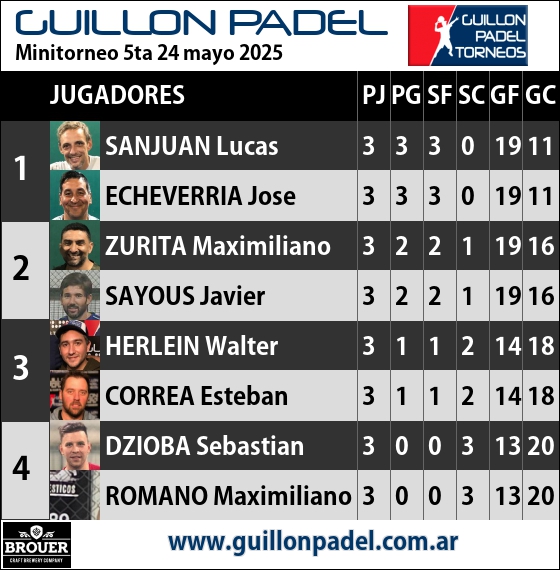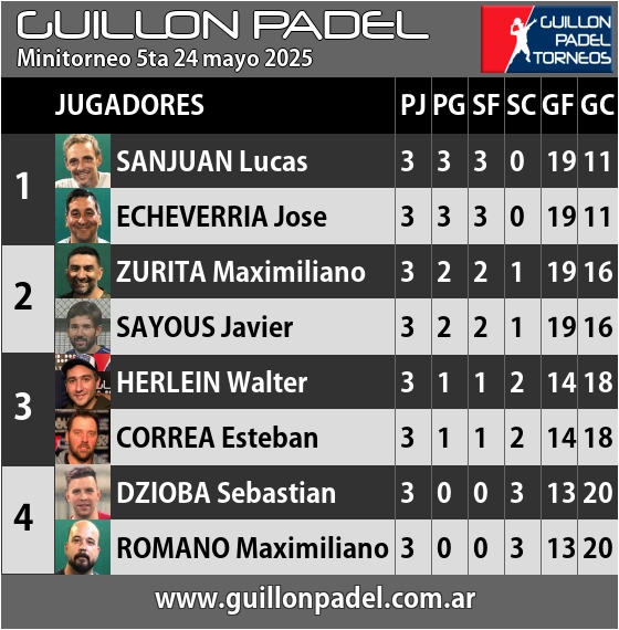 | Torneo Guillon Padel | J | G | SF | SC | GF | GC | ||