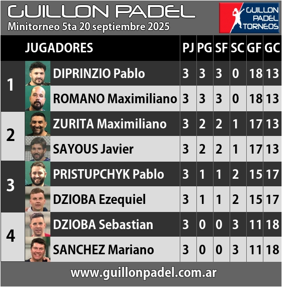 Torneo Guillon Padel ![]() | J | G | SF | SC | GF | GC | ||
